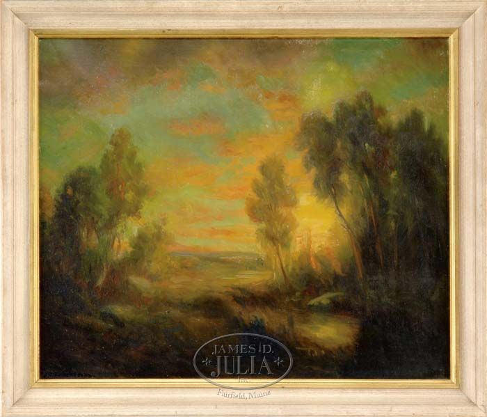 ATTRIBUTED TO JOHN HENRY TWACHTMAN (American, 1853-1902) IMPRESSIONISTIC SUNSET LANDSCAPE. Oil on canvas landscape scene shows a sunset, wispy trees, and small pond. Signed lower left “J. H. Twachtman” which is a later addition. Housed in a white and gold wood frame. SIZE: 20” x 24”. CONDITION: Signature fluoresces, some inpainting at center bottom, otherwise good. 9-90276 MED (6,000-8,000)