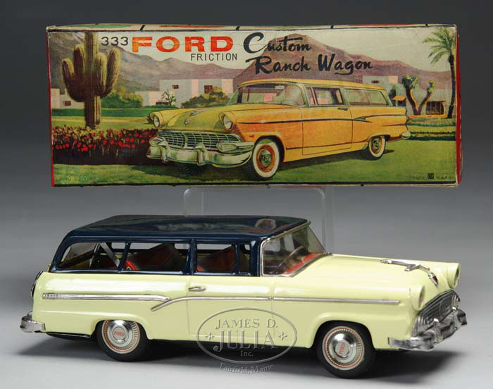 BANDAI FORD CUSTOM RANCH WAGON WITH ORIGINAL BOX. Wagon is lithographed yellow with dark blue roof, chromed bumpers and headlights, rubber tires and celluloid windshield and hubcaps that read “Ford”. Box is brightly lithographed. Also has a store price sticker “J. H. & Company, Chicago”. SIZE: 11-1/2″ l. CONDITION: Car is in excellent plus condition with only a few rub marks. Friction motor inoperative. Lid in very good condition with minor soiling and creases. 1-7460 MC (600-800) Auction: Advertising, Toy & Doll - Spring 2007 Please Note: All prices include the hammer price plus the buyer’s premium, which is paid by the buyer as part of the purchase price. The prices noted here after the auction are considered unofficial and do not become official until after the 46th day. |