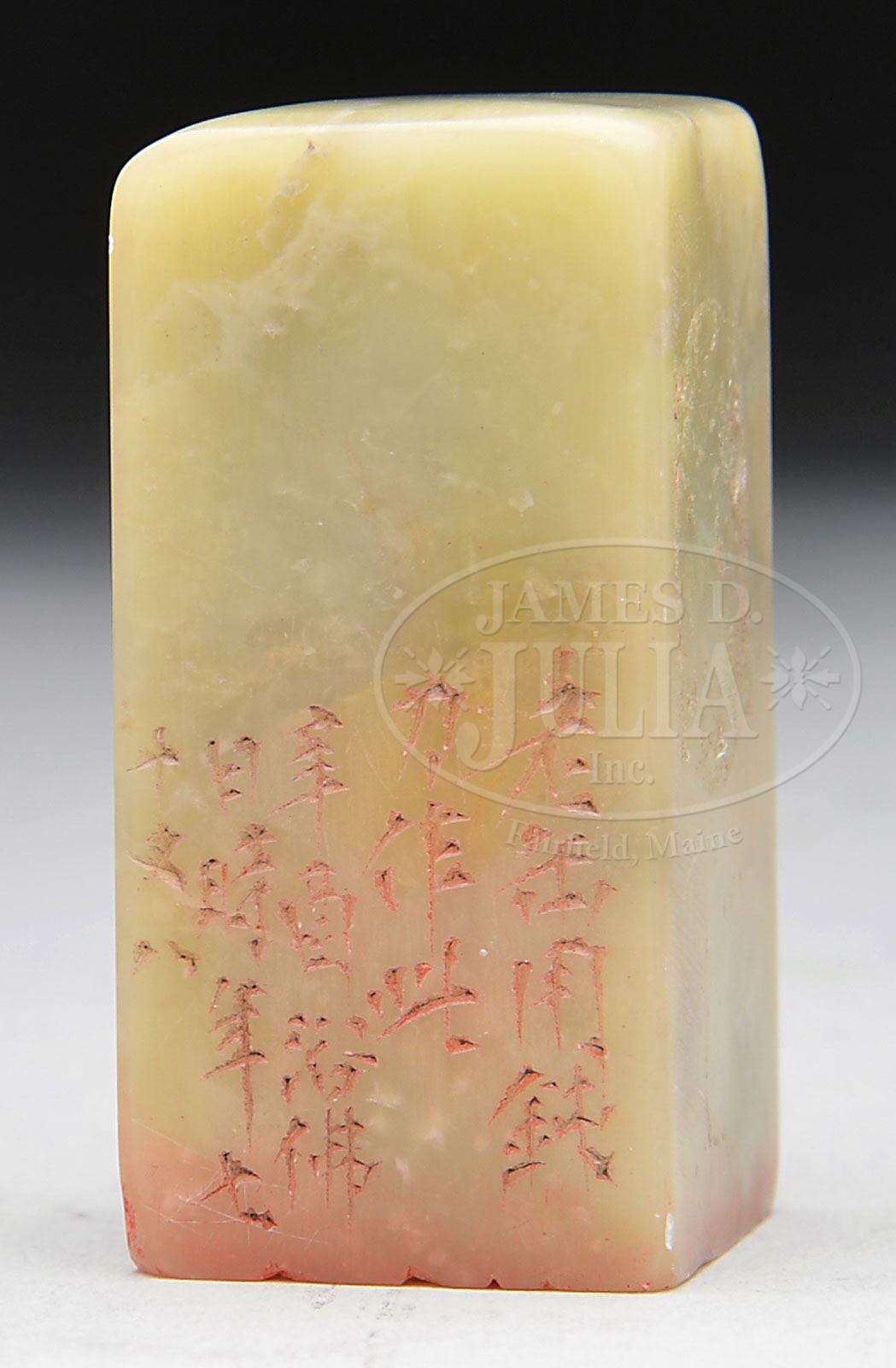 SOAPSTONE SEAL. 20th century, China. Olive colored stone. Seal intact. SIZE: 2″ l. CONDITION: Very good. 9-28692 (300-500)