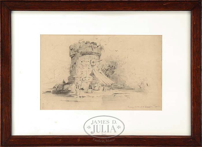 XANTHUS RUSSELL SMITH (American, 1839-1929) TWO PENCIL SKETCHES. 1) Pencil sketch of a locomotive with tender. Inscribed “Phila. of Reading Type in the Eighties”. Signed lower left with initials “X.S.”. Housed in an antique wood frame with white matte. 2) Unsigned drawing of a stone tower with men, barrels and water. Inscribed bottom right “Smugglers at a Beacon Tower”. Housed in a mahogany wood frame with white matte. SIZE: Sight: 1) 5″ x 7-3/4″. 2) 8″ x 13-1/4″. CONDITION: Very good. 9-94310 (400-600)