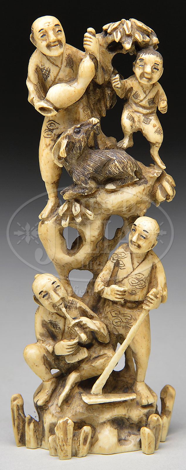 IVORY CARVING. 19th century, Japan. Carving of figures on a mountain. Signed “Genmei”. SIZE: 5″ l. CONDITION: Very good. 7-73809 (200-300)