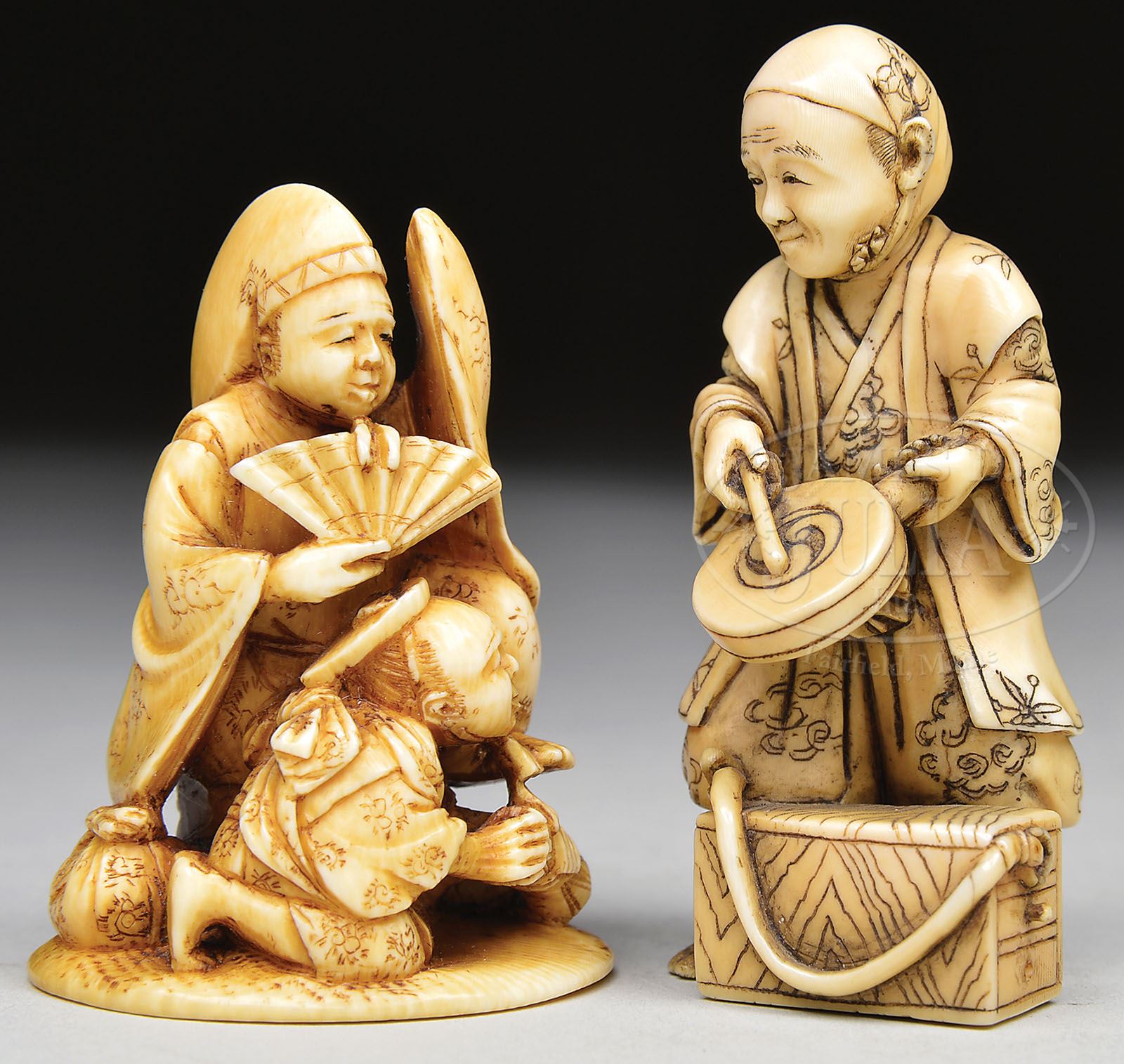 TWO IVORY CARVINGS. 19th century, Japan. A figure of a musician and a netsuke of three dancers. SIZE: 1) 2-1/4″. 2) 2″. CONDITION: Very good. 7-73815 (200-300)