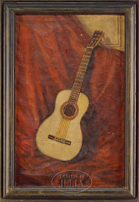 ROBERT EMMETT OWEN (American, 1878-1957) THE GUITAR. Oil on canvas still life scene shows a six string acoustic guitar leaning against red fabric. Signed lower right. Housed in its original molded wood frame. SIZE: 25″ x 16″. CONDITION: Craquelure, two small patches which stabilize break in canvas, some small chips, otherwise good. 9-92044 (200-400)
