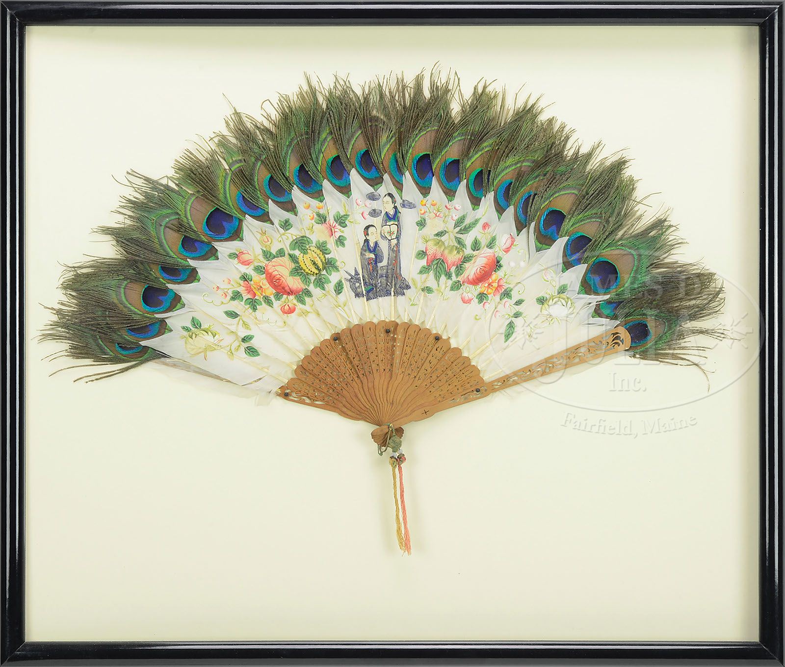 PEACOCK PAINTED FAN. 19th century, China. Pierced wood stays, duck feathers painted with a scene of two women flanked by floral bouquets, the whole edge with peacock feathers. Housed in a contemporary deep ebonized frame. SIZE: Fan: 13″ x 23″ (open). CONDITION: Overall very good and intact. 9-27160 (300-500)