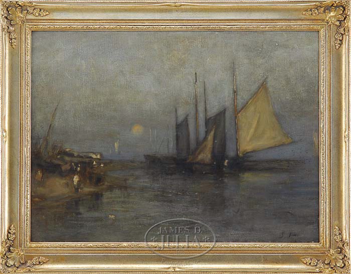 ATTRIBUTED TO GEORGE INNESS (AMERICAN, 1825-1894) FISHING FLEET. Oil on canvas, mounted on board impressionistic scene shows several fishing sailboats along beach with figures, all under a mist-filled sky with sun shining through. signed lower right, “G. INNESS”. Housed in a replacement gesso-decorated gilt frame. SIZE: 20″h x 27″w. CONDITION: Good. 9-95566 (3,000-5,000)
