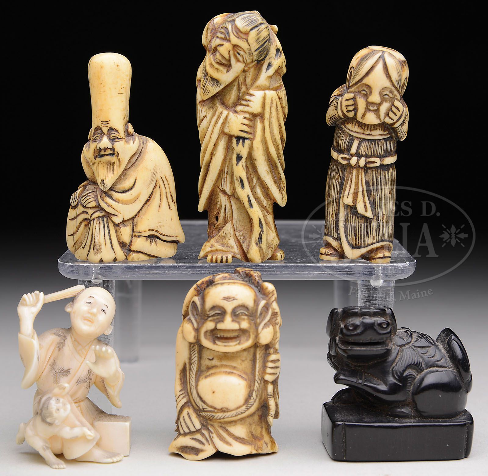 SIX CARVED NETSUKE. 19th century, Japan. Ivory netsuke of a man with a fan and a small child. Four horn netsuke of Sennin. One ebony seal shaped netsuke with a foo dog finial. SIZE: Each about 2″ h. CONDITION: Very good overall with nice color and patina. 7-73399 (200-300)