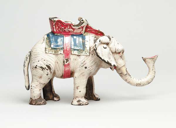 HUBLEY ELEPHANT W/HOWDAH MECHANICAL BANK A white elephant has coin in tip of trunk and when tail is pulled, trunk flies up thereby depositing coin into howdah. SIZE: 8-1/2″ l x 2-1/2″ w x 5-1/2″ h. CONDITION: Paint is in good condition. 1-320 (200-400) Auction: Advertising, Toy & Doll - Spring 2003 Please Note: All prices include the hammer price plus the buyer’s premium, which is paid by the buyer as part of the purchase price. The prices noted here after the auction are considered unofficial and do not become official until after the 46th day. |