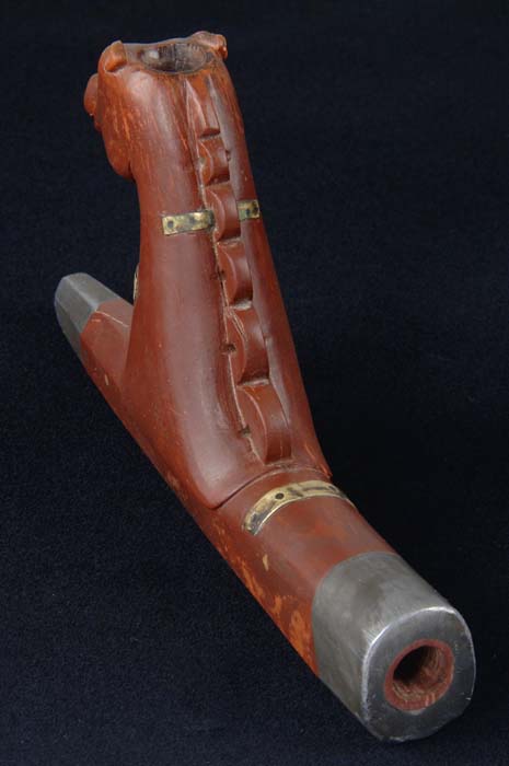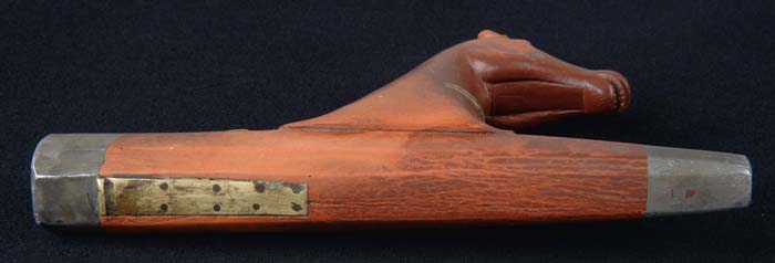 VERY CHOICE PLAINS INDIAN FIGURATIVE PIPE BOWL. Horse effigy style of high form with pewter inlay. Pipe also has a wonderful, old, in-use repaired crack stabilized with what appears to be sections of a brass cartridge case and small rivets. Wonderful sculptural form, mid-19th century. SIZE: Length: 7”; height: 4”. CONDITION: Small chip on right ear. 4-30521 JJK2 (4,000-6,000)