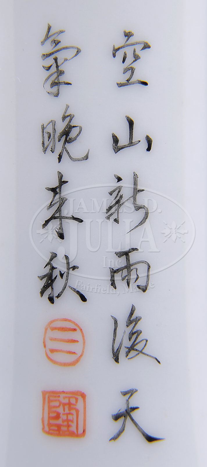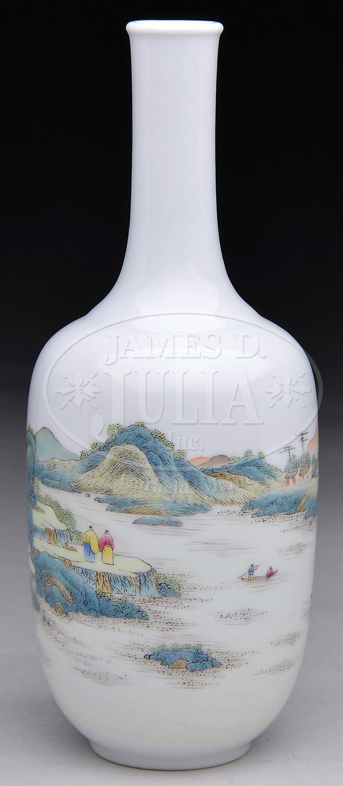 ROULEAU SHAPED BOTTLE FORM PORCELAIN VASE. Early 20th century, China. Famille Rose enameled landscape and a poem at the neck. 6-character Ch’ien Lung mark on red on the base. SIZE: 8-1/4″ h. CONDITION: Very good. 7-73932 (200-300)