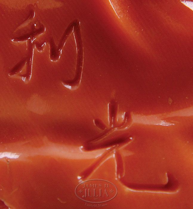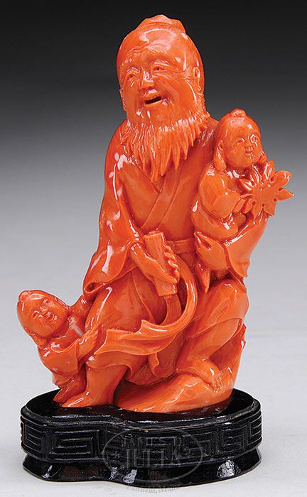 CORAL CARVING. 19th century, Japan. Figure of Jurojin with children. Coral of deep salmon pink color. Signed. SIZE: 4-3/4” h overall. CONDITION: Very good. 9-26665 (2,500-3,500)