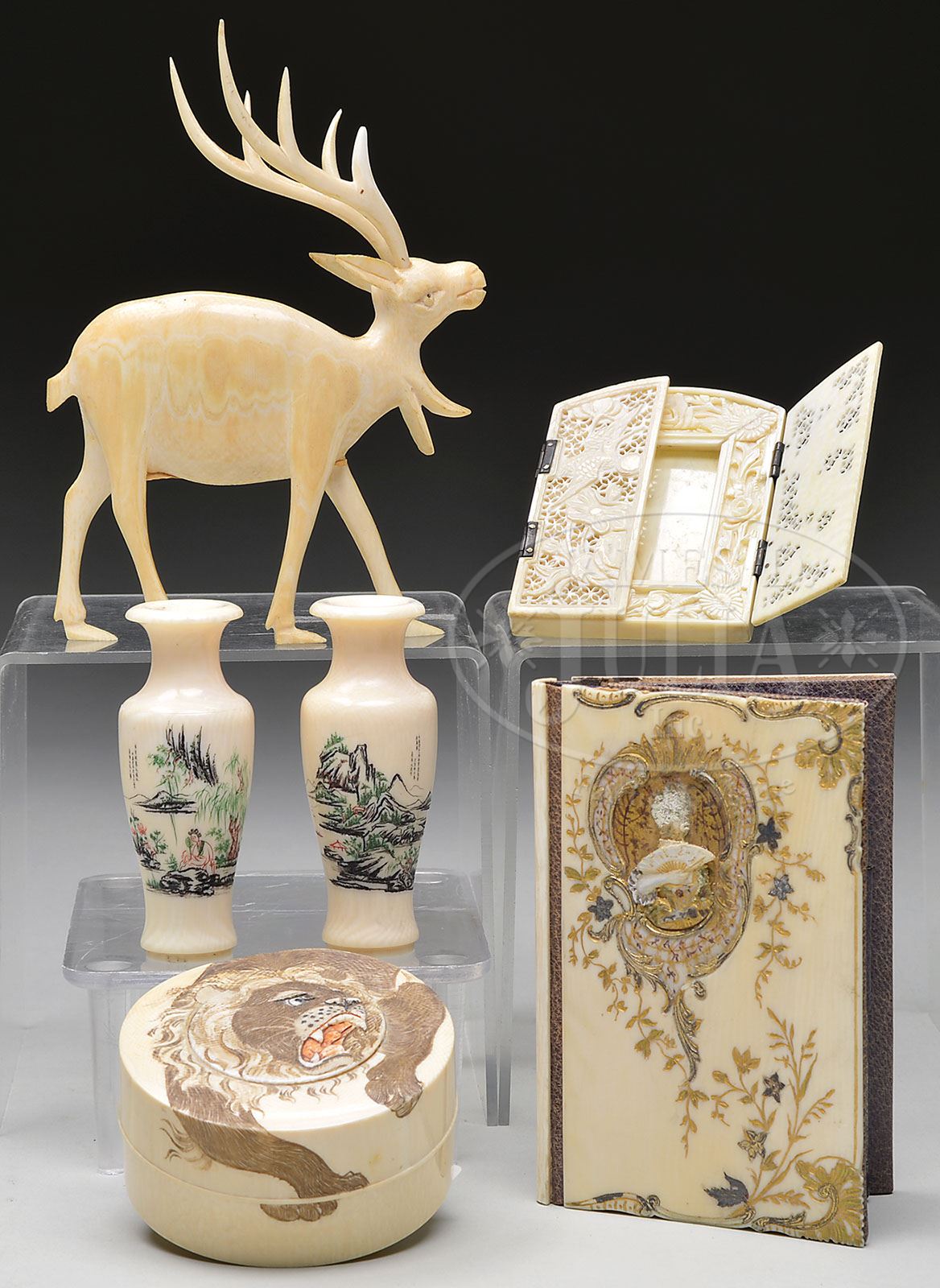 GROUP OF SIX IVORIES. 19th century. Includes a European dance card with a carved and inlaid cover; an African gazelle; a Chinese dragon boat and stand; a pair of polychrome decorated vases; a miniature picture frame; and a Japanese box carved with a lion. SIZE: Boat: 7-1/4″ l. Box: 2-1/2″ dia. CONDITION: Dance card with missing inlay. One vase with chip at mouth. Otherwise good. 9-29292 (300-400)