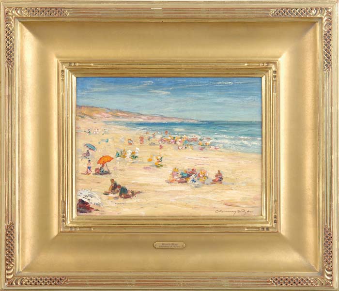 CHAUNCEY FOSTER RYDER (American, 1868-1949) “BEACH DAY”. Oil on board colorful beach scene shows many beach goers in colorful suits, some with beach umbrellas. A curving beach with dunes is seen under blue skies. Signed lower right “Chauncey F. Ryder”. Housed in a fine reproduction arts & craft carved gilt frame. SIZE: 9-1/4” x 12-1/4”. CONDITION: Minor inpainting, very good. 9-70915 (12,500-17,500)