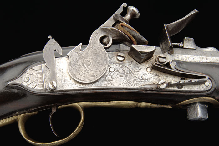 EXTREMELY RARE BREECHLOADING DOGLOCK MUSKET. NSN. 74 Cal. 44-1/4” part oct bbl. No markings are visible. The lockplate, brass triggerguard, buttplate, sideplate and faucet escutcheons are engraved. A .781 plug 1-5/8” long is screwed into the bottom of the bbl to contain the chamber. A 1/2” wrench is needed to extract it. This musket came from the W. Keith Neal Collection and has been the subject of numerous articles and book chapters concerning 17th C. Tudor or English siege weapons, including Neal & Back’s Great British Gunmakers 1540-1740. (See Plates 44-a through e for the exact gun.) It was sold along with parts of his collection in 1995. Copies of the provenance listed in that catalog accompanies the lot. It is variously described as having a flat lockplate, “engraved with strawberry foliage and with dog-catch in the form of a bird’s head”, with a sideplate in the form of a monster and a thumb piece with “a caricature head”. This figure of a soldier wearing a helmet has a very long nose. The gun came from Timsbury Manor near Bath, England and dates around 1670. To load it, it was turned upside down and the screw plug removed with a wrench, the powder was poured in and the gun tipped up so the powder would go to the rear and the ball was inserted on top of the powder and the screw put back in. The lock was then ready for priming and firing. In J. N. George’s book, English Guns & Rifles, he indicates that guns of this type may have been used in the towers by snipers during a siege to shoot the officers of the siege force. The dragon sideplate is possibly replaced. There is very light raised carving around the bbl tang. There is no hammer screw on the outside of the lock. The lug on the back of the hammer extends through the lockplate and through the tumbler and is secured by a pin passing through the lug. The sear is also secured by a pin and operates against the top of the hammer, unlike most, later flintlocks. There is no bridle on either the tumbler or the frizzen. The front lockplate hook appears to be a replacement. There is a long extension on the tang of the buttplate with block engraving matching that on the breech plug escutcheon. The large v-notch rear sight has a folding leaf with three peepholes drilled in it. There is a large turned ring at the muzzle which has a brass bead sight on top. CONDITION: Lock has a smooth gray patina with some light pitting. Bbl and rear sight have very heavy pitting. Brass furniture has a mellow patina. Stock shows minor repairs and the rear of the lockplate and sideplate with a repaired crack through the wrist. Mechanically fine. 4-59136 FS778 (10,000-20,000)
