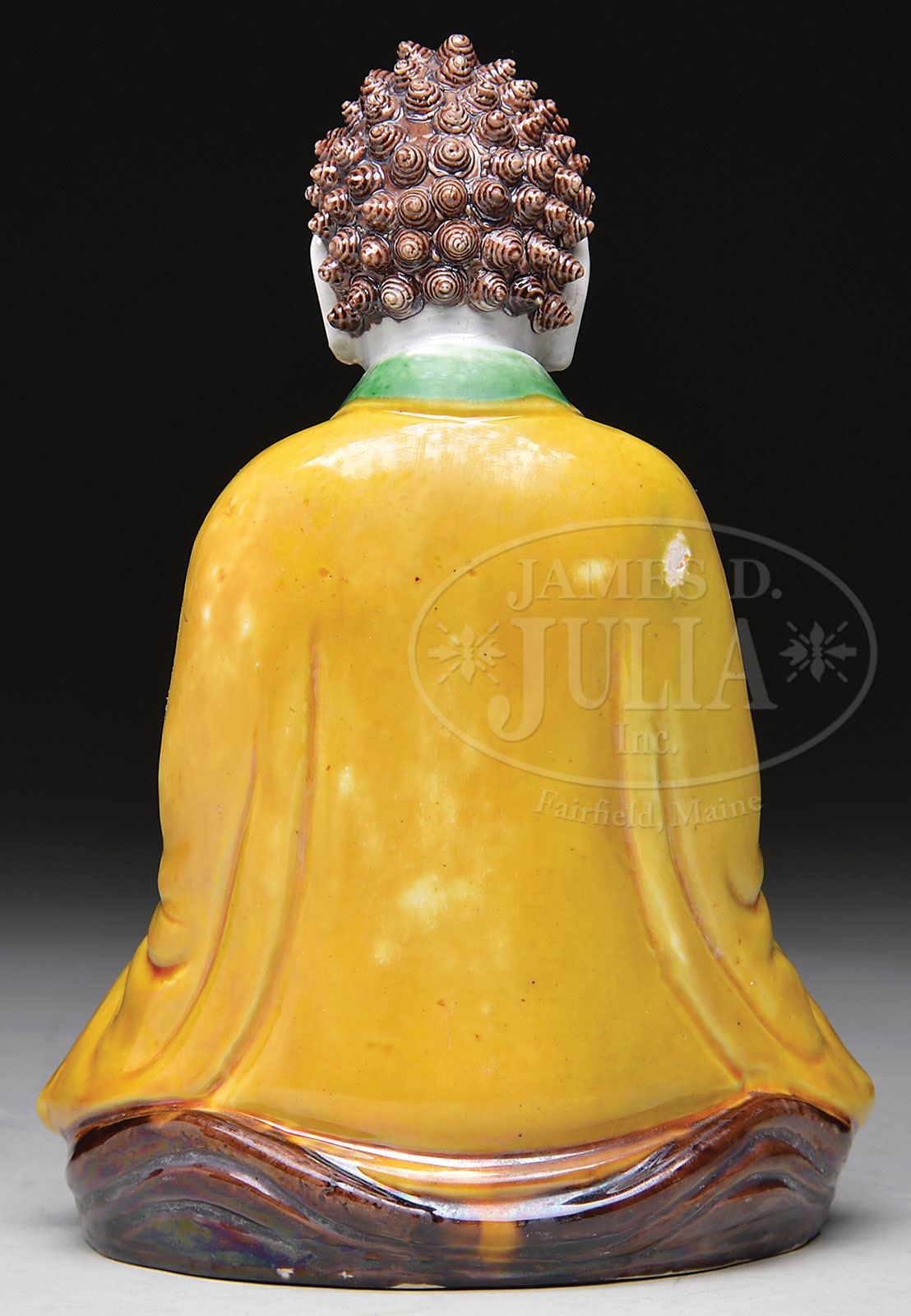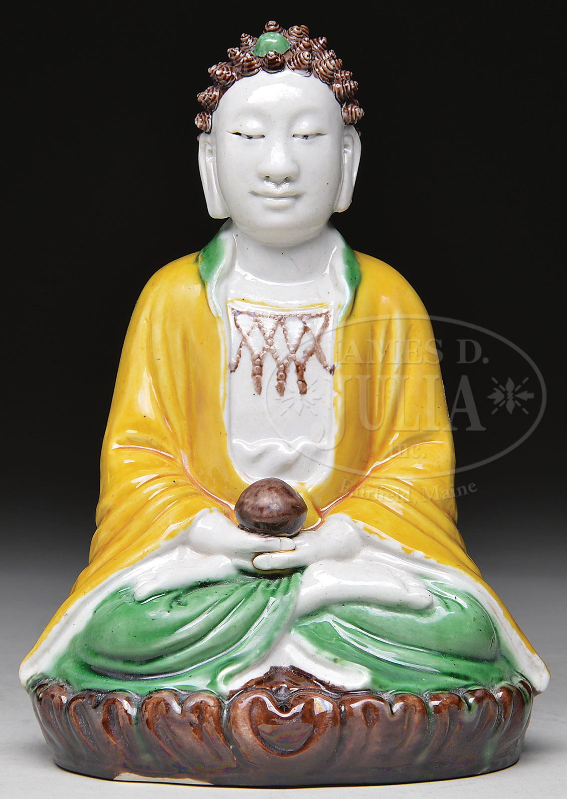 PORCELAIN BUDDHA. Late 19th, early 20th century, China. San Tsai ware. Seated figure of Amida with aubergine, green, yellow and white colors. SIZE: 9-1/4″ h. CONDITION: Very good. 7-73901 (200-300)