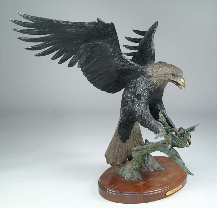 BEAUTIFUL LARGE BRONZE BALD EAGLE BY ARTIST BOB PARKS. Fantastically detailed eagle posed landing on a bare wood snag. Eagle has 41-1/2″ wing span, tip to tip, and stands approximately 34-1/2″ high from the bottom of the oval wooden base and from the trailing feathers to the front of the wood snag is approx. 34″. Head & tail feathers are wonderfully toned to give the impression of flight. Eyes & beak are toned a second color and the feet & talons are yet two other colors with the body & wings being a dark bronze color. Oval walnut base is approx. 22″ wide x about 15″ deep x 2-1/2″ high and has a narrow brass plaque on the front inscribed “SPIRIT OF AMERICA” with the artist’s name. Very heavy, weighs approx. 100 lbs. It has been reported that were only four of these magnificent eagles cast by this artist. CONDITION: Extremely fine. All the toning & detail are as they left the artist’s studio. Tips of the wing feathers show slight polishing. 4-57099 (12,500-17,500)