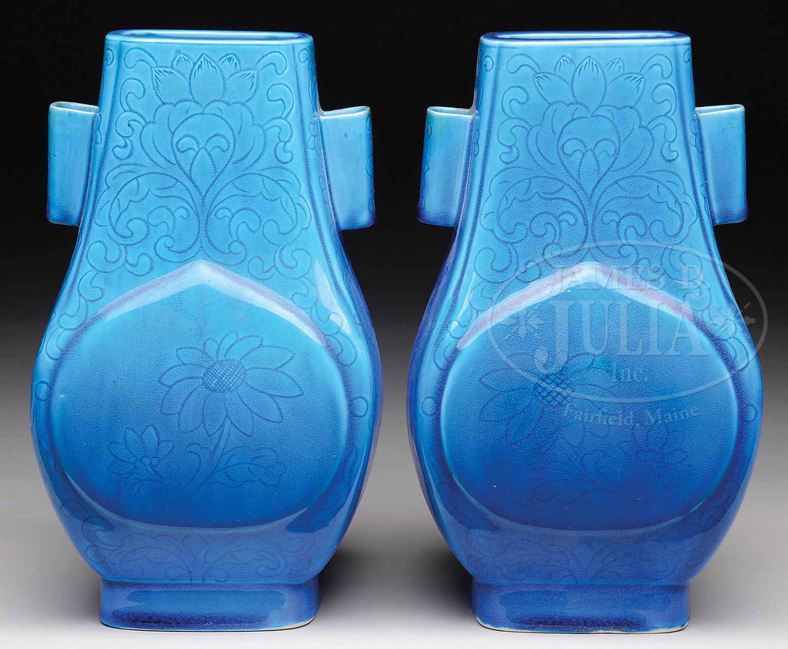 PAIR OF PORCELAIN VASES. Late 19th, early 20th century, China. Engraved decoration of floral scrolling and floral reserves inside peach shaped relief panels. Monochrome turquoise glaze surface. SIZE: 8″ h. CONDITION: Very good. 7-73395 (200-300)