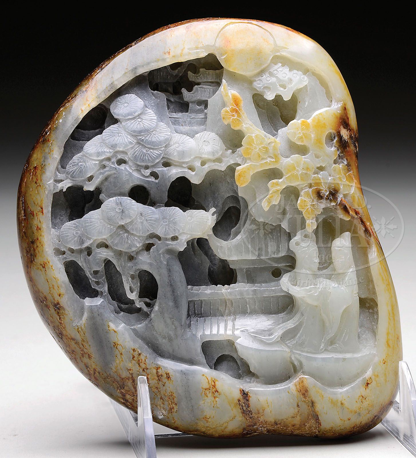 JADE CARVING. 20th century, China. Mountain deeply carved to reveal two figures in a mountain pavilion. Stone of a gray color with brown markings. SIZE: 6-1/4″ x 5″. CONDITION: Very good with nicely polished surfaces. 9-28029 (200-300)