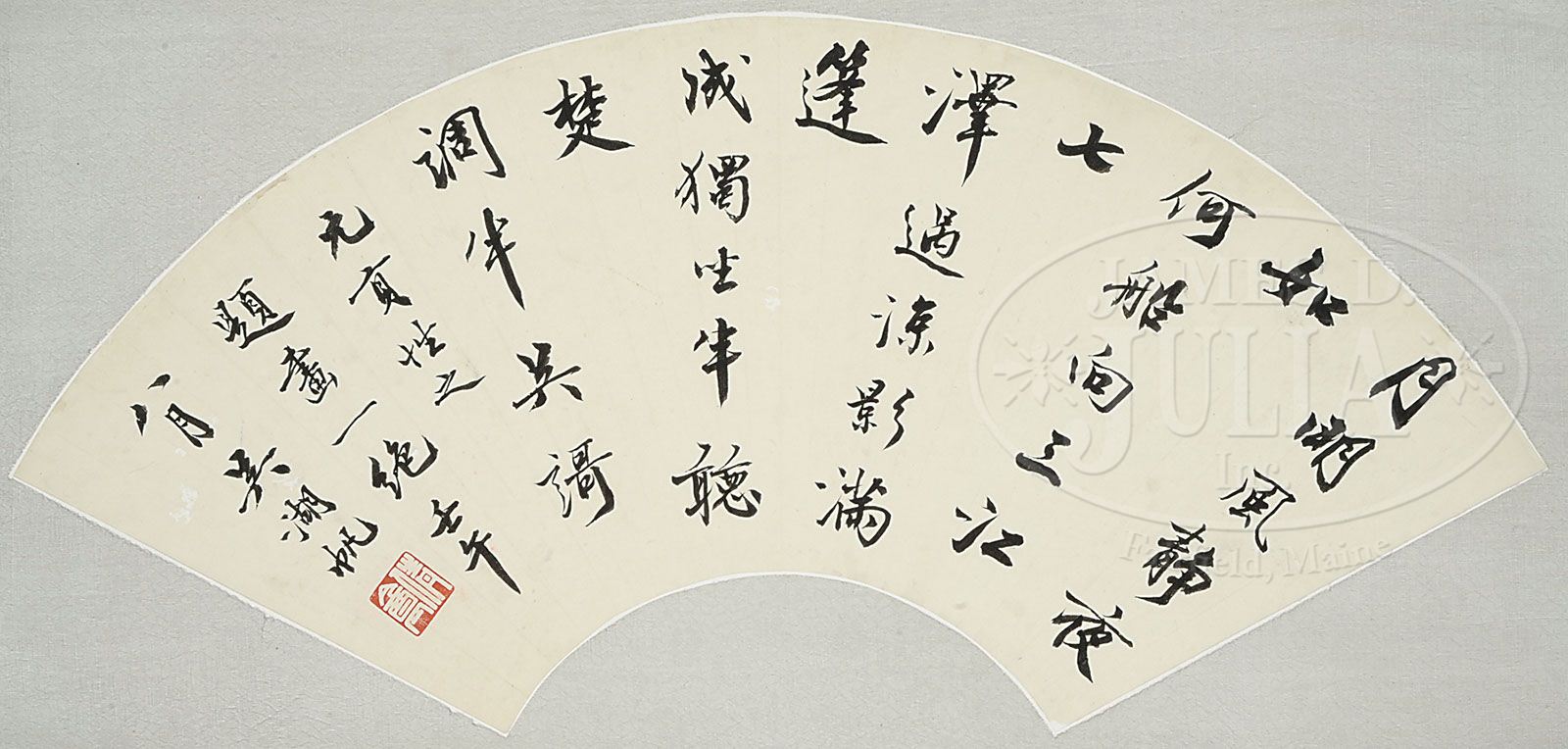 FAN CALLIGRAPHY, CHINA. With poetic inscription, signed “Wu Hufan,” dated the eighth month in renwu year, with one seal. SIZE: 7-3/8″ x 20-3/8″. CONDITION: Good with minor loss to the paper. 9-26416 (200-300)