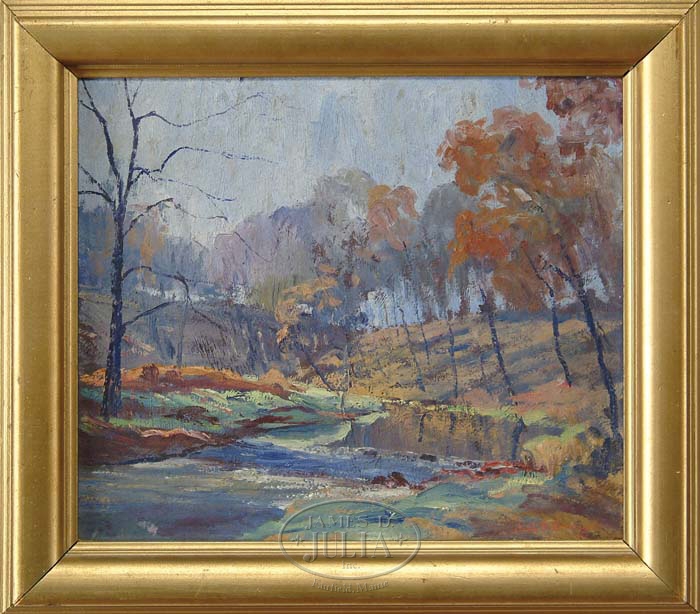 JOHN F. BERNINGER (American, 1897-1981) FALL LANDSCAPE WITH RIVER. Oil on board scene shows a river cascading over rocks beside a hillside dotted with trees in fall foliage. Signed lower right. Housed in a gold molded wood frame. “Berninger is one of the premier artist’s to come out of the Baum school and is best known for his well-executed landscapes of the Lehigh Valley”. SIZE: 12” x 14”. CONDITION: Very good. 9-29953 (3,000-5,000)