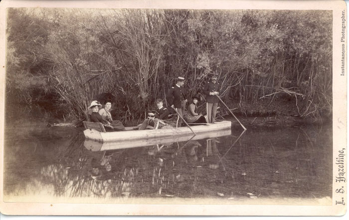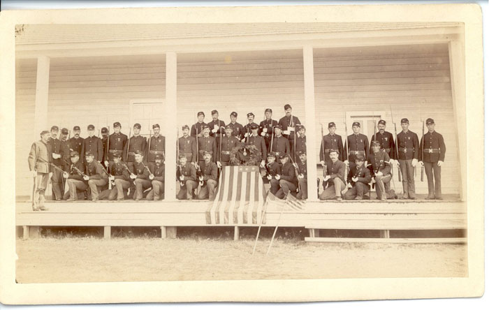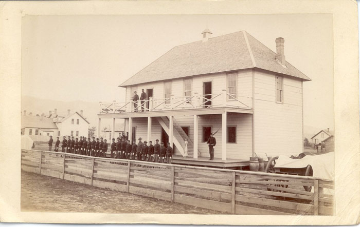 LOT OF EIGHT CABINET PHOTOS, INDIAN WARS BY L. S. HAZELTINE. Two 7” x 9-3/4” photos, military men and children outside a house, other is twenty-four men in a tent encampment. Five 5-1/4” x 8-1/2” cards showing men and tents, military men outside building, carriage outside of house, military men and women in boat, and posed photo of men with guns and flag on porch. One 4-1/4” x 6-1/2” photo of men playing cards around table. CONDITION: Very good. 8-86968 (1,400-1,800)