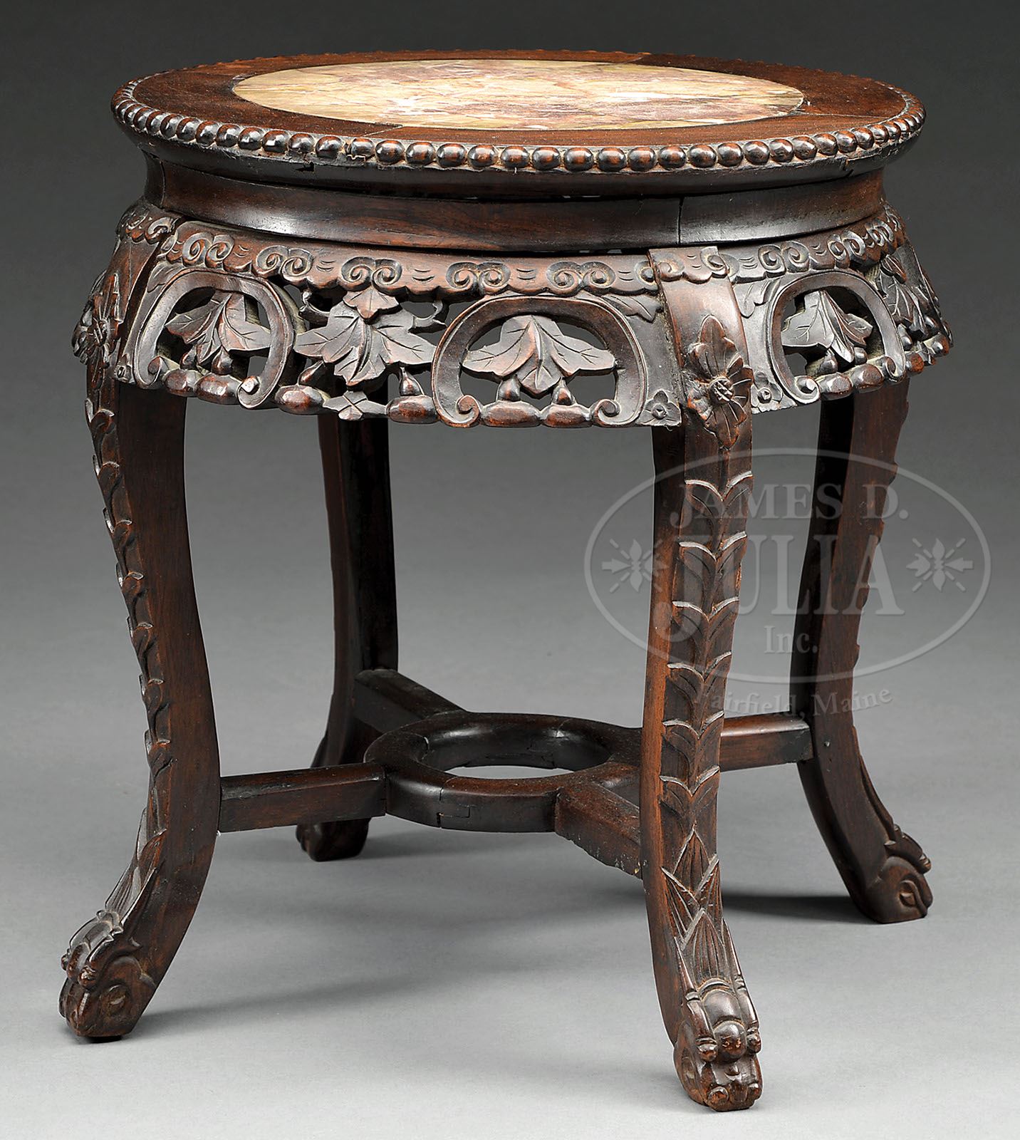ROSEWOOD MARBLE TOP TABOURET. Late 19th/ early 20th century, China. The round insert marble top within a conforming border with beaded edge. The apron pierced and carved with double gourds and leaf tips raised on foliate carved cabriole legs joined by an X-form stretcher with central roundel. SIZE: 18-1/2″ h x 17-1/2″ overall dia. CONDITION: Generally very good with original surfaces. 7-73767 (100-150)