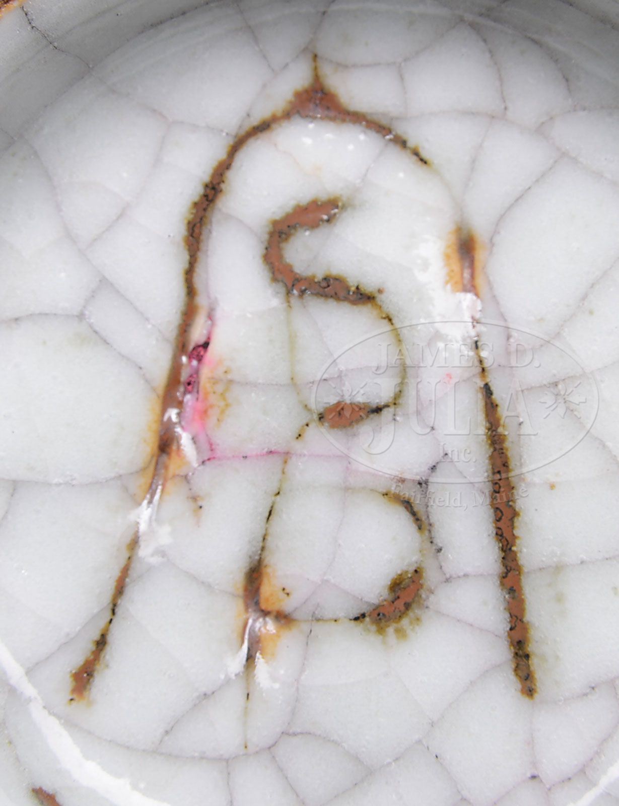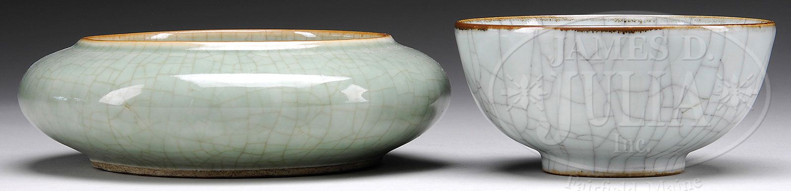 TWO PORCELAIN PIECES. 19th, early 20th century, China. Celadon wares. A “Kuan” style bowl with a crab claw crackle and impressed character on the bottom together with a shallow narcissus bowl. SIZE: 1) 5″ dia. 2) 7-1/2″ dia. CONDITION: With crackle as noted, very good overall. 7-73208 (200-300)