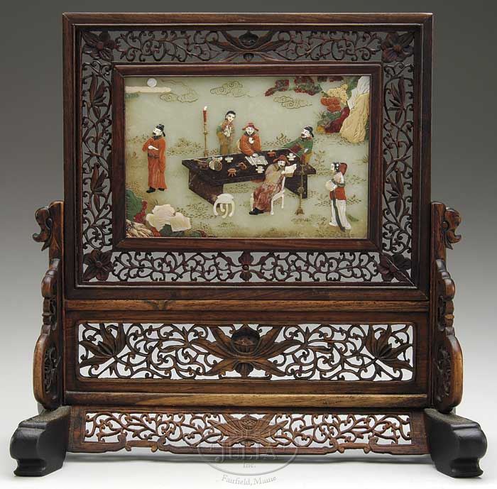 TABLE SCREEN. 19th century, China. Carved Huanghuali inlaid with a jade plaque with a scene of scholars at a table. Inlaid with soapstone, mother of pearl and bone. SIZE: Screen: 13″ h x 13″ w. Panel: 4-1/2″ h x 7″ sight. CONDITION: Very good. 9-26218 (12,000-18,000)