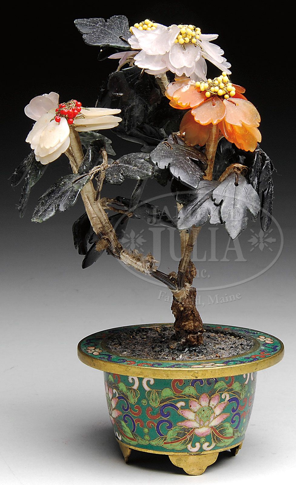 SMALL JADE AND HARDSTONE BONSAI TREE. Chinese, 19th century. Flower petals of translucent white jade and other colored hardstones, with spinach jade leaves, mounted in a round cloisonne footed urn. SIZE: 6-1/2″ h x 4-1/2″ dia. CONDITION: Overall very good. 9-25226 (100-150)