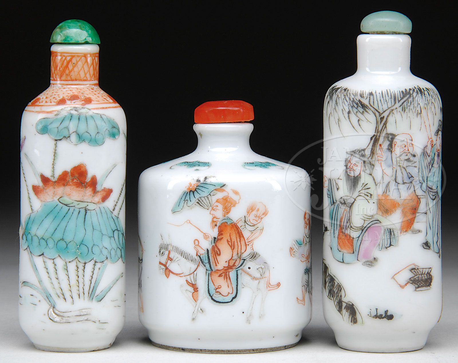 THREE PORCELAIN SNUFF BOTTLES. Famille Rose decoration of lotuses and historical scenes. SIZE: Tallest: 3-1/4″ h. CONDITION: Wear to enamels. Lids present. 7-72611 (100-200)