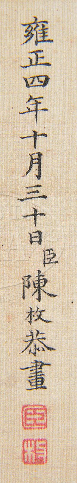PRINT, CHINA. Print of painting by Chen Meigong, depicting two birds perched on plum branches and rockery, with two seals, wood box. SIZE: 53-1/2” x 14”. CONDITION: Foxing. Mounted in hanging scroll format. 7-73961 (800-1,200)