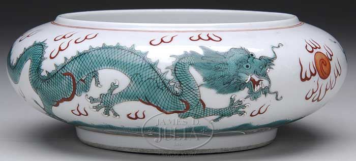 PORCELAIN BOWL. 19th century, China. Ch’ien Lung mark on the base. Shallow planter decorated with green enameled dragons and iron red pearls. SIZE: 3″ h x 8″ dia. CONDITION: Very good. 7-72930 (300-500)