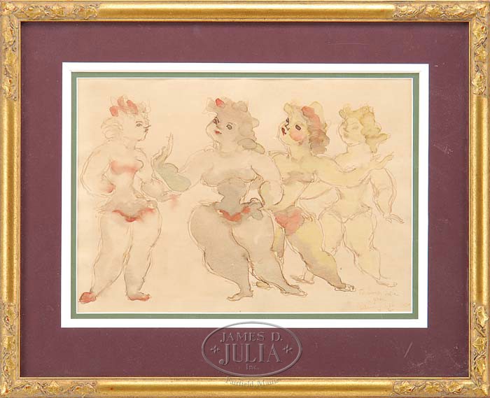 CHAIM GROSS (American, 1904-1991) THE FOUR DANCERS. Watercolor depicting four burlesque type dancers. Inscribed and signed bottom right and dated “1950”. Housed in a modern ivy decorated gilt frame with triple matte. SIZE: Sight: 9-1/2″ x 13-1/2″. CONDITION: 1″ tight tear in upper center, otherwise very good. Examined out of frame. 9-94038 (800-1,200)
