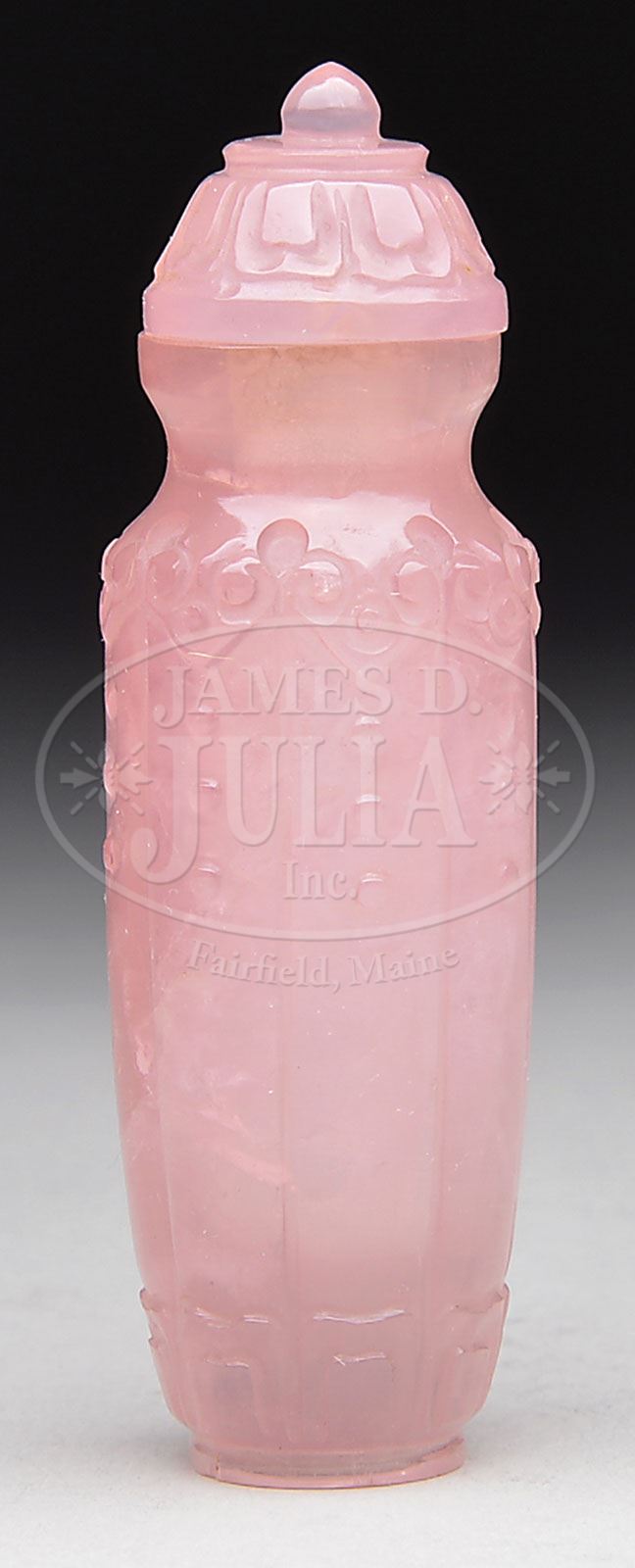 ROSE QUARTZ SNUFF BOTTLE. 19th century, China. The vasiform fluted body with borders of Ju-i and acanthus leaves, well hallowed with matching stopper. SIZE: 3″ h. CONDITION: Very good. 7-73601 (200-300)