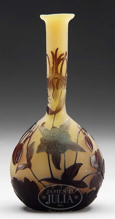 GALLE BANJO VASE. Very nice Galle banjo vase has purple cameo leaves and stems against a frosted creamy yellow background. The center of the front of the vase features a light blue cameo flower in full bloom. Signed on the back side in cameo “Galle”. SIZE: 6-1/2″ h. CONDITION: Very good to excellent with tiny fleabite to tip of one stem. 5-67574 (1,000-1,500)