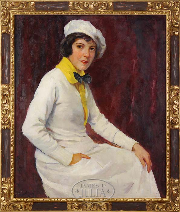 PAULINE LENNARDS PALMER (American, 1867-1938) WOMAN IN WHITE. Large oil on canvas three-quarter portrait of a young woman dressed in a white dress with yellow collar and black bow-tie. She wears a white French style hat which is cocked to the side and she smiles at the viewer. She is set against a plum colored background. Signed lower left. Housed in a fine carved and partially gilt wood frame. SIZE: 36″ x 30″. CONDITION: Very good, some minor inpainting. 9-94340 (2,000-3,000)