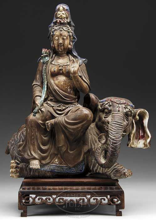 STONEWARE GROUP OF SAMANTABHADRA ON HIS ELEPHANT. Chinese. Nice example with enameled highlights featuring the bejeweled Buddha with deep indigo headdress and an enameled lotus stem and blossom astride a fanciful recumbent elephant with enameled trappings and six tusks. Together with a hardwood stand. SIZE: 19″ h x 16″ l. CONDITION: Very good with original surfaces. 9-23944 (2,000-4,000)