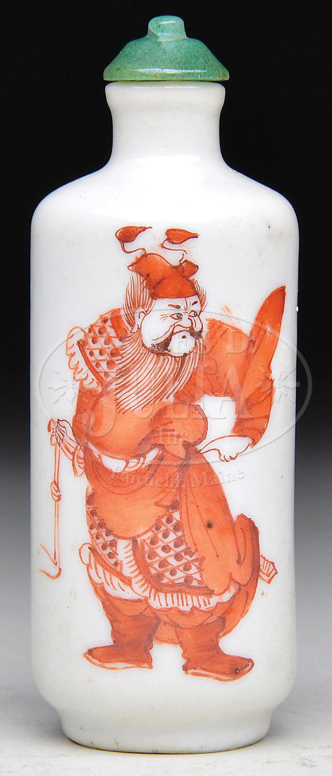 PORCELAIN SNUFF BOTTLE. 19th century, China. Cylindrical form with iron red decoration of a warrior and two bats. 4-character Ch’ien Lung mark on the base. SIZE: 3″ l. CONDITION: Very good. 7-73893 (200-300)
