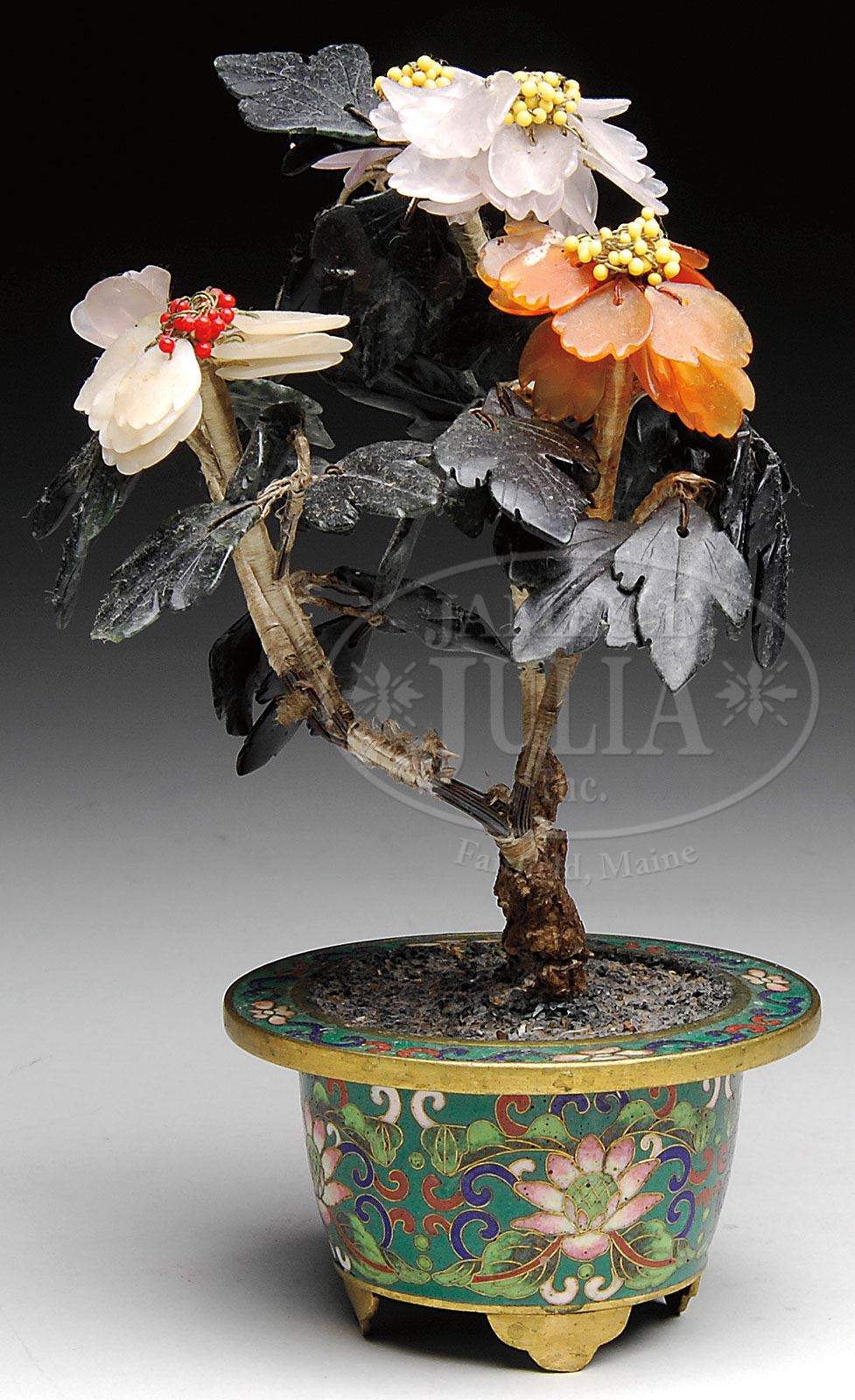 SMALL JADE AND HARDSTONE BONSAI TREE. Chinese, 19th century. Flower petals of translucent white jade and other colored hardstones, with spinach jade leaves, mounted in a round cloisonne footed urn. SIZE: 6-1/2″ h x 4-1/2″ dia. CONDITION: Overall very good. 9-25226 (50-100)