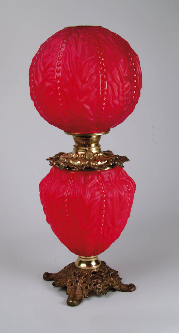 RED SATIN GWTW LAMP. Beautiful blown-out red satin glass shade and base have drapery type design in eight panels surrounding the shade and base. Each panel is separated by a non-satin beaded strip. Base sits on a filigree brass foot with matching collar around font. SIZE: 25″ tall. CONDITION: Lamp has been electrified and there are some roughness to fitter edge. The base appears darker than the shade, otherwise very good to excellent. 5-67825 (600-900)