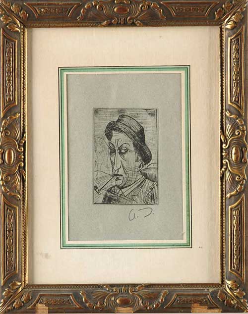 ANDRE DERAIN (French, 1880-1954) PORTRAIT OF A MAN WITH HAT AND PIPE. Etching on tinted paper shows older man with black hat and long pipe with wrinkled eyes. Pencil signed “A. D.”. Housed in a decorative copper gilt frame with highlighted matte. IMAGE SIZE: 3-1/4” x 2-1/4”. SIGHT SIZE: 5-1/2” x 4”. CONDITION: Very good. 9-98778 (600-800)