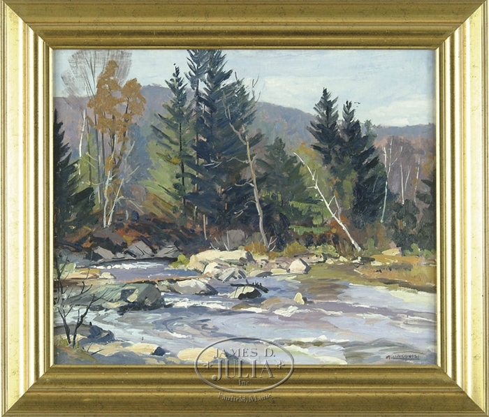 ARTHUR LINGQUIST (American, 1889-1975) “VERMONT TROUT STREAM”. Oil on canvas New England scene shows a rushing stream through boulders lined with evergreens and birches. A mountain is in the background under blue sky. Signed lower right “A Lingquist”. Housed in a fine modern gilt molded wood frame. SIZE: 20” x 24”. CONDITION: Very good. 9-27123 (1500-2500)
