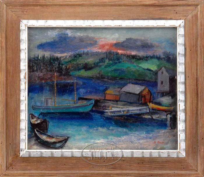 NICHOLAS LUISI (American, 1894-1977) MONHEGAN HARBOR. Oil on canvas bright colored scene shows several boats in a small inlet harbor with dock and buildings. A bright colored setting sun is seen behind green forested hills. Housed in a natural wood carved frame with white liner. PROVENANCE: Acquired by consignor directly from the artist’s family. SIZE: 18” x 22”. CONDITION: One small patch to reverse with corresponding inpainting. Very good. 9-74437 MD (1,000-2,000)