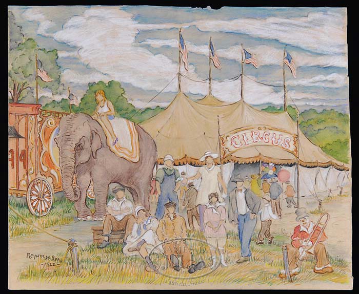 REYNOLDS BEAL (American, 1867-1951) CIRCUS, 1922. Unframed mixed media scene shows a group of circus performers seated and standing next to an elephant and circus wagon in front of a large tent with four American flags. Signed lower left and dated “1922”. SIZE: 11-1/4″ x 13-3/4″. CONDITION: Very good. 9-95147 (1,500-2,500)