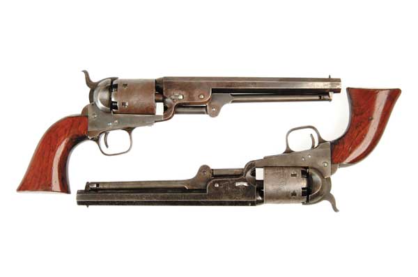 SPECTACULAR AND UNUSUAL PAIR OF COLT 1851 NAVY REVOLVERS FROM FRANKFORD ARSENAL. Cal. 36 Perc. Scarce, inscribed Navies with 7-1/2” oct bbls, New York address with case colored frame and 1-pc walnut grips. Both revolvers have the round head screws with Colts patent on the left forward side of the frame and a small “2” on the left side of each bbl. These both have the very scarce large iron trigger guard and backstrap. The backstrap of #44866 is inscribed in period block letter engraving “Major 1st Regt.” and #45064 is inscribed on the backstrap “Division Inspector”. They are accompanied by a very old walnut box 19-5/8” l x 5-3/8”w x 5-1/2” h. It is beautifully made with dovetailed corners, brass hook latches and a brass scallop cornered plaque 2-5/8” x 1” inlaid in the lid. The plaque is inscribed “U.S./Frankford Arsenal/1860”. The lid has mitered corners and fits very tight over an inside dust rail. Inside the box has two sliding blocks mortised into each end, which allow the two revolvers to be stored side-by-side in the case. The one block has recesses for the muzzles and the bottom recesses for the toes and recesses for the hammers in the lid. The area around the muzzle recesses, the heel and hammer recesses, the block back of the butts and the compartment at the end are all lined with faded old green velvet. The compartment contains a sleeve of original Gold Marks caps in original cardboard boxes. CONDITION: 1) #44866. Very fine, all matching including the wedge. Bbl retains about 90% bright original blue mixed with lightly flaked spots, which have turned to patina. The lever arm and rammer are a silver/gray patina with the rammer pivot retaining good faded colors. The frame retains 20-25% faded case colors with the balance turned silver. The Colt Patent markings are very faint. The cylinder is an even light gray patina with scattered light pitting and a couple scratches, it retains about 95% crisp Naval battle scene. All the pins are peened over. The hammer retains about 75% dark case colors with a spot of deep pitting and scattered fine pitting on the left side. The grip frame retains traces of blue in the very sheltered areas with the balance a dark gray patina. Grips are extremely fine with very light edge wear and retain 96-98% strong bright varnish. The bore is strong and bright with moderate pitting. Good mechanics. 2) #45064. Very fine, all matching including the wedge. Bbl retains 70-75% original blue turning plum with scattered light surface rust and a ring of light pitting by the front sight. The lever arm and rammer are silvered case colors with traces of color on the sides of the pivot, brilliant in the sheltered areas. The frame retains about 50-60% faded case colors with the balance a medium gray patina. The Colt’s Patent markings are very thin. The cylinder is a light silver/brown patina with a couple of small dings and what may be a vise mark, otherwise retains about 95% crisp Naval battle scene. Five of the 6 pins are intact with one mostly peened over. The grip frame retains blue only in the very sheltered areas, being an even medium gray/brown patina. Grips are superb with only minor edge wear and a few handling and use marks, retaining most of their original strong bright varnish. The bore is bright and shiny with scattered moderate pitting. Crisp mechanics. The box is also very fine, having a very dark age patina on the exterior with an area around the plaque in the lid cleaned from polishing the brass, with a few light scratches and a bruise or two. The interior also has a fine age patina. 4-49955 JR356 (15,000-25,000)
