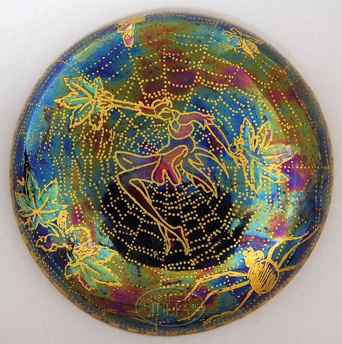WEDGWOOD FAIRYLAND LUSTRE MALFREY POT. Rare Fairyland Lustre 3-5/8″ Malfrey Pot, Shape No. 2308 is decorated with the Elves and Bell Branch pattern depicting elves and goblins dancing on mushrooms with spider webs in the background against a midnight blue glaze. Lid features a center fairy in the center of a spider web with gold gilded spider at one side with small fairies and leaves randomly scattered. Signed on underside with gold and black Portland vase mark, “Wedgwood England” and “Z4968”. SIZE: 3-5/8″ t. CONDITION: Very good to excellent. 5-66314 (3,000-5,000)