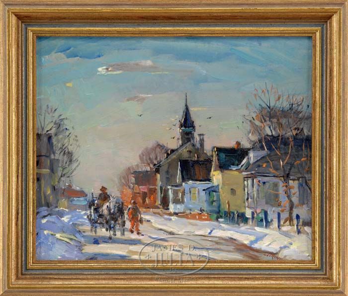 ANTONIO CIRINO (American 1889-1983) HORSE WAGON ON WINTER STREET. Oil on board winter scene shows two figures in a one horse wagon walking toward viewer on a snowy street. Street is lined with colorful houses and a church under a late afternoon blue sky. Housed in a modern gilt frame. SIZE: 10” x 12”. CONDITION: Very good. 9-90066 SM (1,500-2,500)