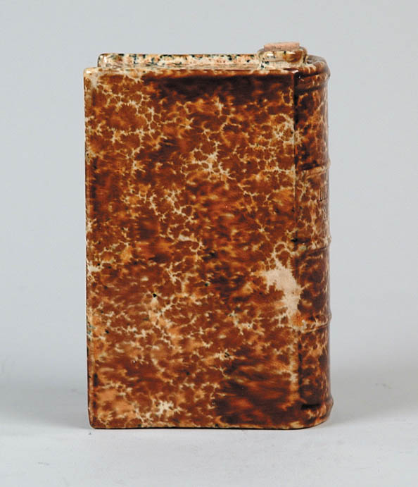 BENNINGTON TYPE FLINT ENAMEL BOOK FLASK. “Departed Spirits” title book form with nice coloration of specks of blue, green gold and brown. SIZE: 5-1/2” h x 3-3/4” w. CONDITION: Very good. 9-93926 (400-600)