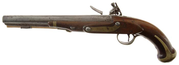 HARPERS FERRY MODEL 1806 FLINTLOCK MARTIAL PISTOL. Cal. 56. SN 1695. 10” rnd bbl. Dated 1808 on tail of lockplate, other markings are standard. “V / JS” cartouche on left side of stock. Ramrod has been replaced. There is also a “US” at base of grip between triggerguard and butt cap. CONDITION: Gray patina overall with very light pitting except at muzzle where it is slightly heavier. There is a short crack at rear lockplate screw and another on left side of forearm running from front lockplate screw through bbl wedge to bbl band. Mechanically fine. 4-30268 FS103 (9,000-10,000)