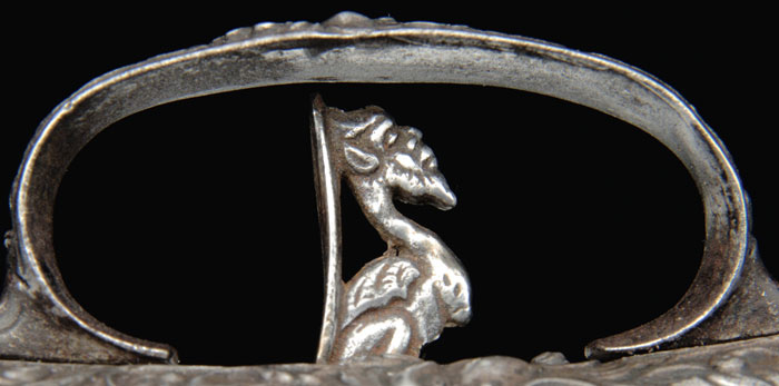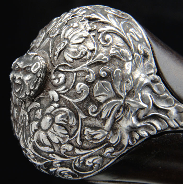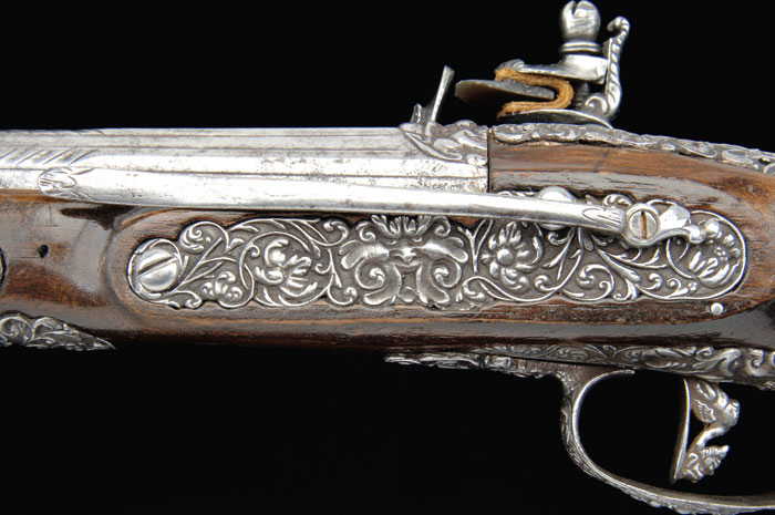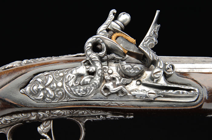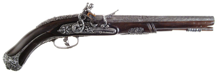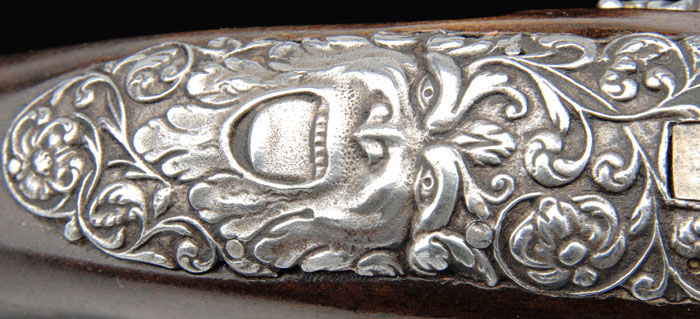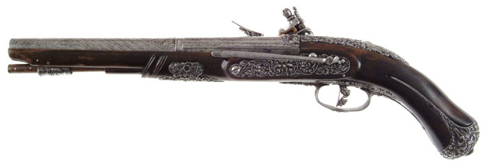 SCARCE VICENZO COMINAZZO ROYALTY QUALITY FLINTLOCK PISTOL. Cal. About 65. NSN. Spectacular pistol with 11” fluted round to ovoid shaped bbl with incised decorations on both sections with a turned transition, having foliate patterns at transition. Top flat is marked with maker’s name & three stamped stars. Flat in front of flash pan is marked with Batista’s name “G. Bai Tiani Giio”. Breech end of bbl & top tang have a deep relief carved face. Top of wrist, around top tang, has applied cast steel with a demon face at back end. Lockplate has another demon face at back end with a deep relief rendition of Leda & The Swan. Hammer is also deep relief cast with a human figure and foliate & floral decorations. Bottom of pan has another demon face, as does the front of frizzen. Side of frizzen spring is file decorated. Furniture is all iron with a sgl iron guide containing what is probably the orig iron tipped ramrod. Forestock has a carved transition with a demon face central applique. Sideplate also has a demon face with flower & vine decorations. Trigger guard has another demon face with a filigree front finial of flowers & vines and trigger plate with deep relief cast flowers & vines. Trigger has a cast relief of what appears to be a demon bird with human head & bird body. Buttcap, with its very long, thin langets, has a cast demon face on each side with full coverage flowers & vines and a tiny demon face screw cover. Sideplate has an added, lightly decorated belt hook. This pistol certainly dates before 1696, for tht is when Vincenzo Cominazzo was put to death. Altogether a most decorative & unusual pistol, probably made for Italian royalty. CONDITION: Fine to very fine. Metal all has an old cleaned patina being a silver/gray color with some mottling on bbl and scattered fine pitting. Wood is sound & retains about all of a restored finish. Mechanics are a little stiff, dark bore. 4-58409 JR425 (3,000-5,000)