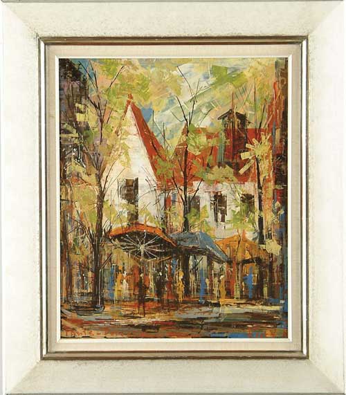 AZEGLIO DIPALMA (French, Mid-20th C) “PLACE DU TERTRE, MONTMARTRE”. Oil on masonite scene shows colorful buildings and street having umbrellas and people. Signed lower left “Paris – Duterire”. Signed lower right “Kest”?. This painting was purchased by the consignor as the painter was painting it. Artist name and title are on the back of the frame and dated 1965. Housed in a white painted wood frame with silver and linen liner. SIZE: 22” x 18-1/2”. CONDITION: Very good. 9-97596 (600-1,000)